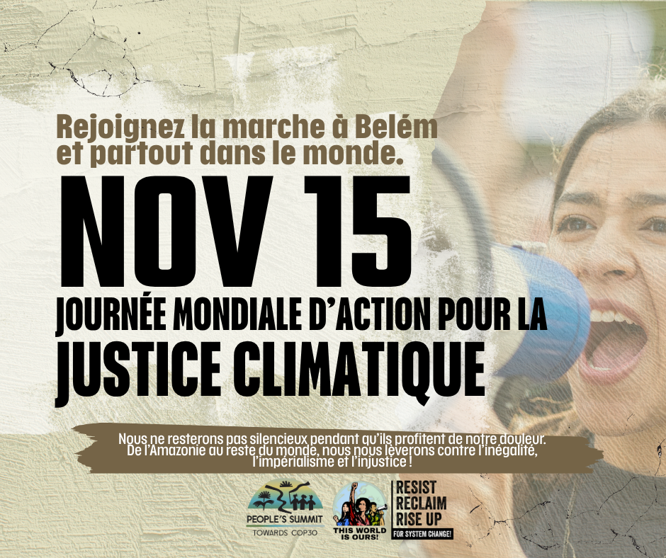 This mobilization is part of the series of collective actions we committed to at the start of the year. Together, we will march in Belém during COP30 and in cities across the world to confront and change the system that fuels inequality, exploitation, and climate destruction.